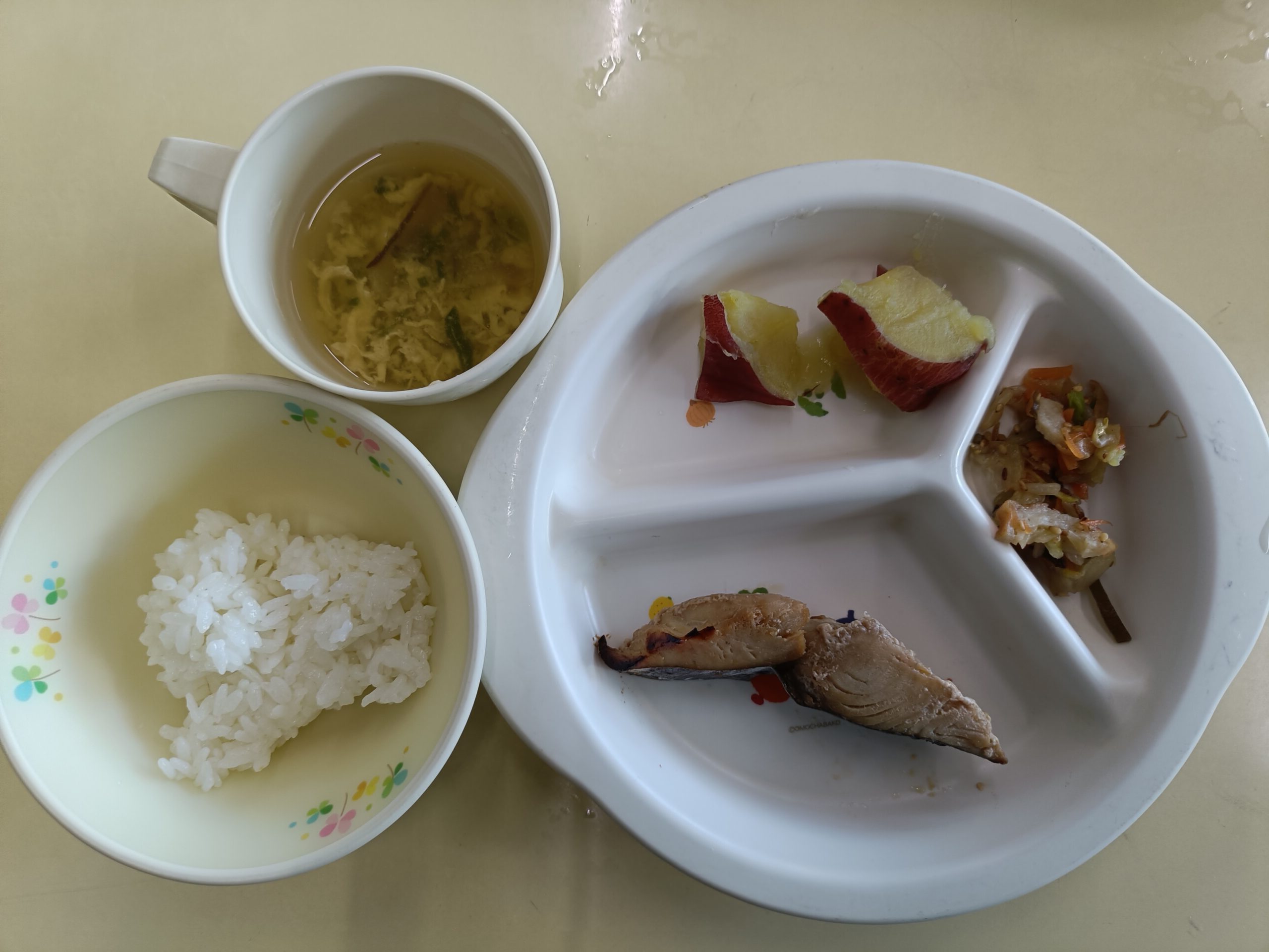 ごはん、さわらの柚庵焼、里芋とれんこんの煮物、白菜の塩昆布和え、かきたま汁