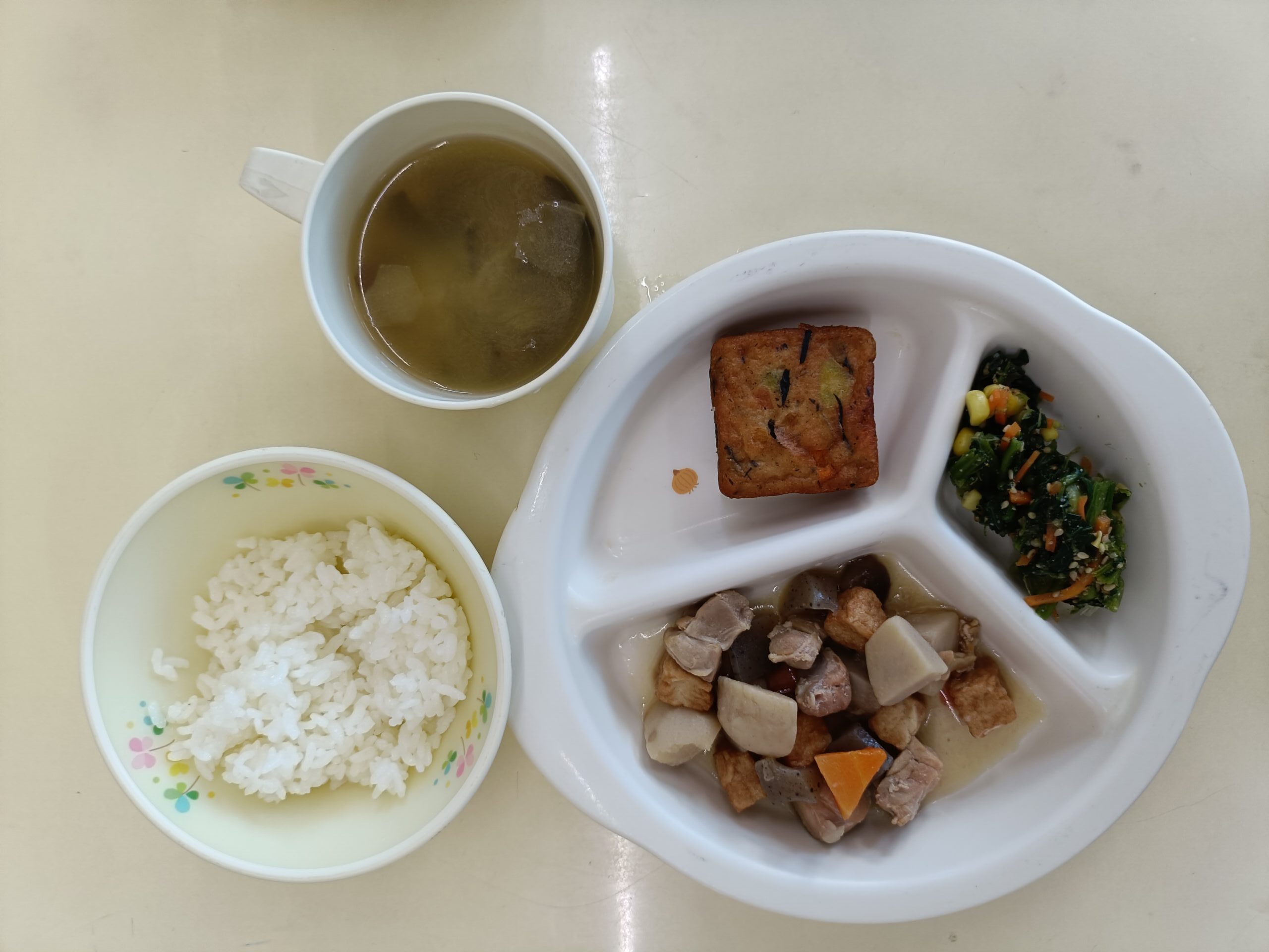 ごはん、芋炊き、ひじきと野菜の豆腐揚げ、小松菜のごま和え、味噌汁